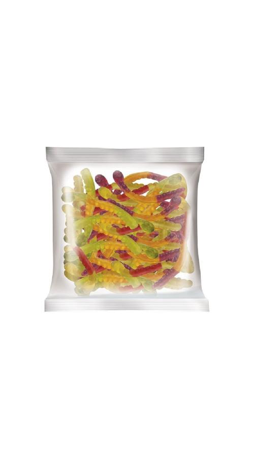 Жевательный мармелад со вкусами персика и апельсина, клубники и банана, черной смородины и лимона. Мармелад в виде змеек, посыпанный измельченным сахаром с небольшим добавлением яблочной кислоты. Жевательный мармелад гармонично вписывается в систему здорового питания: