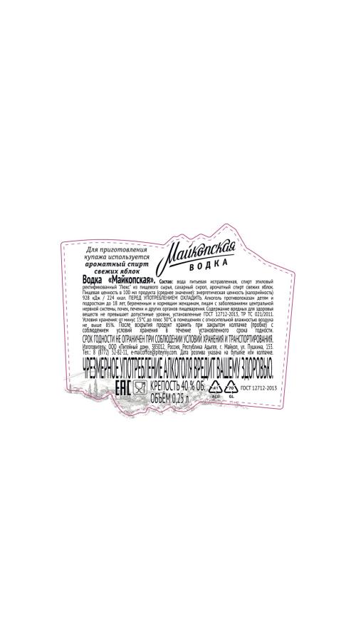 Водка "Майкопская" — водка, которая создается путем купажирования спирта класса "Люкс", очищенной воды из водоемов Адыгеи и настоя яблок. Данная марка известна и любима в России уже несколько десятилетий, еще со времен Советского Союза. Водка хорошо сочетается с острыми блюдами, мясом, рыбой, сельдью, соленьями и первыми блюдами.